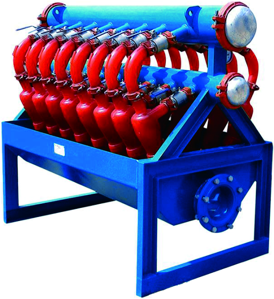 鉆井泥漿在除砂器倉(cāng)經(jīng)過砂泵輸送到除泥旋流器中,在砂泵的壓力下,泥漿流的沖擊力下,鉆井泥漿在旋流器中形成旋渦狀而鉆井液中的固體在離心力和重力的作用下,沉降到旋流器底部,最后經(jīng)由滴流嘴噴射出來。固體顆粒會(huì)在底流篩進(jìn)行進(jìn)一步的篩分和過濾。而輕一些的,干凈的液體將通過旋流器組的排出管線直接流到除泥倉(cāng)內(nèi)。除泥倉(cāng)內(nèi)的液體會(huì)被離心機(jī)泵繼續(xù)供給離心機(jī)做第四級(jí)固控處理。