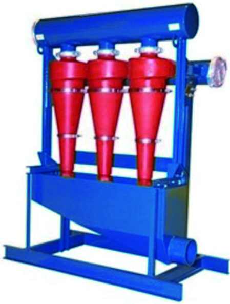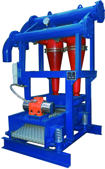 鉆井泥漿在振動篩倉經(jīng)過砂泵輸送到除砂旋流器中,在砂泵的壓力下,泥漿流的沖擊力下,鉆井泥漿在旋流器中形成旋渦狀而鉆井液中的固體在離心力和重力的作用下,沉降到旋流器底部,最后經(jīng)由滴流嘴噴射出來。固體顆粒會在底流篩進行進一步的篩分和過濾。而輕一些的,干凈的液體將通過旋流器組的排出管線直接流到除砂倉內(nèi)。
