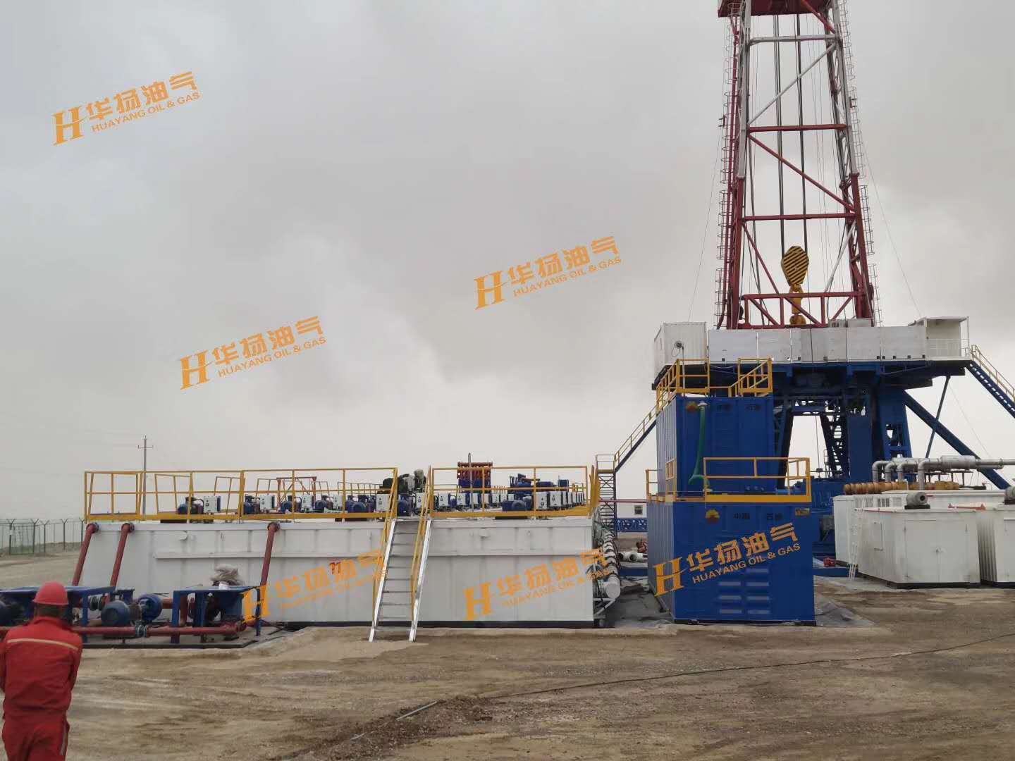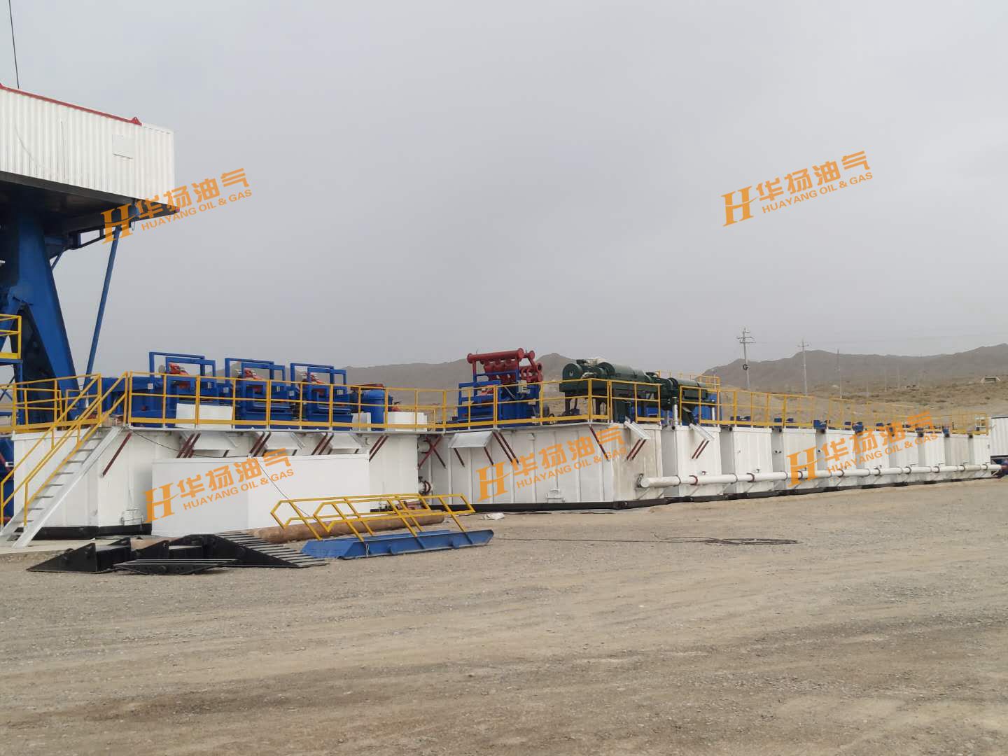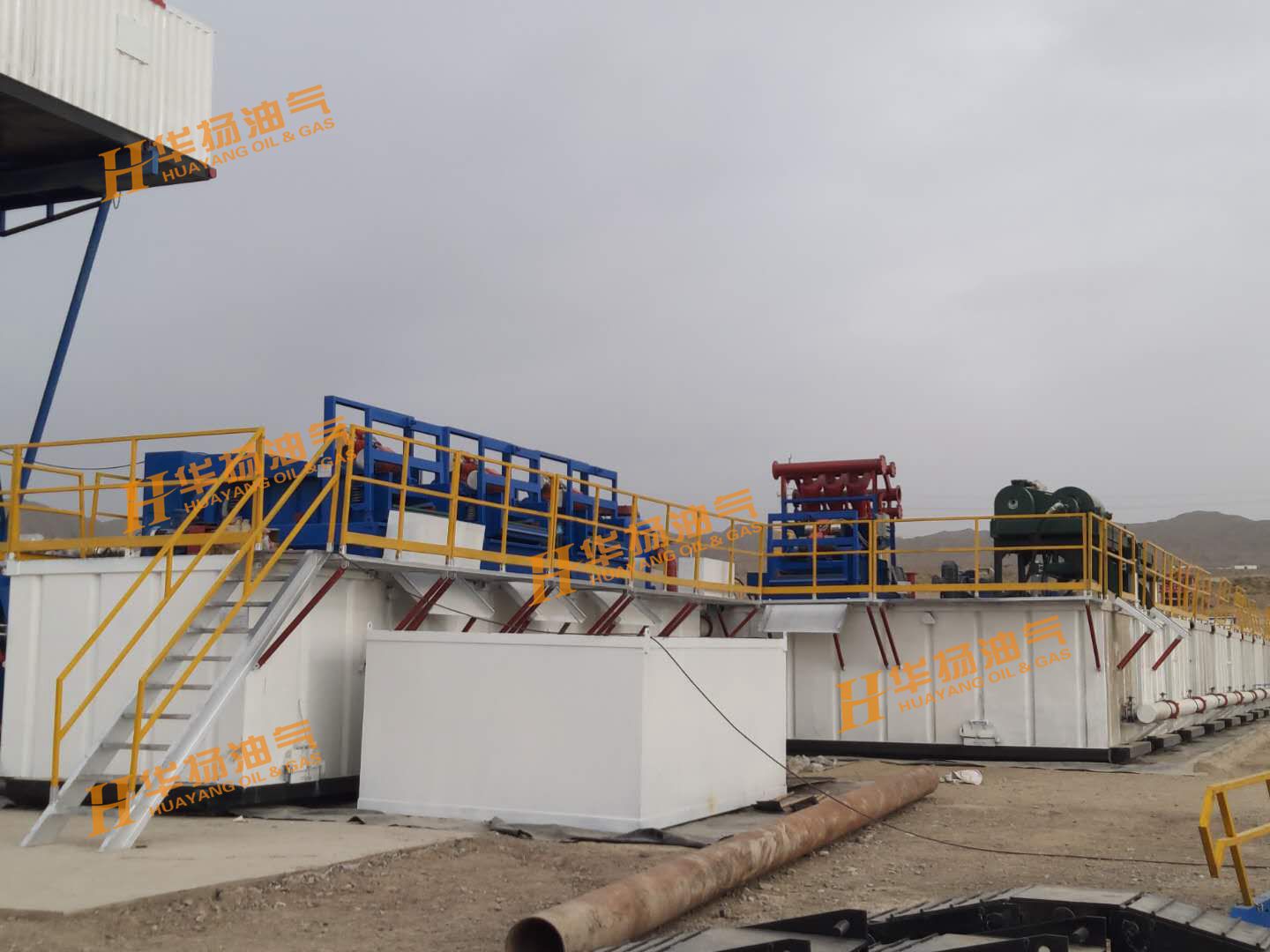 ZJ70-4500DBL鉆機(jī)配套固控系統(tǒng),包括了11具泥漿罐、HYZS703三聯(lián)振動篩、HYZCQ270真空除氣器、HYQJ250X3S-100X16N除泥除砂一體機(jī)、HYLW600中速離心機(jī)、HYLW350-1N高速離心機(jī)、HYJBQ15攪拌器、HYSLH150-50雙加重系統(tǒng)、HYJQH150-50剪切混漿系統(tǒng)等設(shè)備。